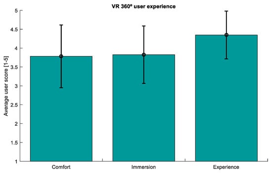 Figure 10. Average across participants of the user experience survey answers. This survey evaluated three aspects of the 360-degree experience: comfort, level of immersion, and general experience. The Y axis represents the mean score of the three aspects, from 1 to 5. Vertical black lines indicate the standard deviation of the mean.