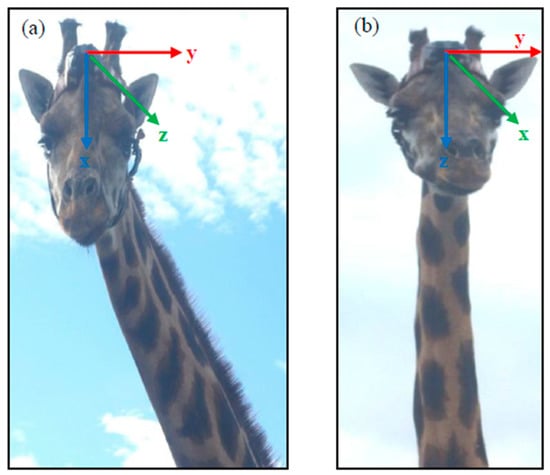 Attachment of the accelerometers, shown on the female giraffes, with the axes’ orientation for the (a) e-obs and (b) AWT accelerometer; red: sway (lateral movement), green: surge (anterior-posterior movement), blue: heave (dorso-ventral movement).