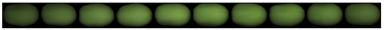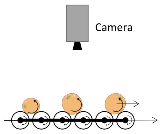 In practice, the use of a roller conveyor is the the most common approach to rotate fruits [22,23]. However, the rotation is not well controlled due to differences in fruit sizes and shapes; therefore, some surface portions might be overlapped or missed due to the non-uniform rotation.
