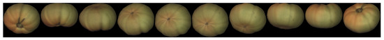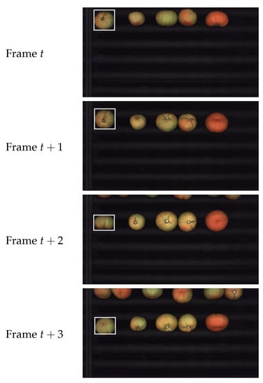 Figure 2 shows a few consecutive frames captured by the camera. The same fruit is highlighted in all the images to illustrate how it rotates while moving downwards. After segmentation, it is possible to obtain a set of views for each fruit, as it is shown in Figure 3 for the tomato highlighted in Figure 2.