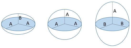 This section explains how to estimate the three principal axes of the spheroid model using the major and minor principal axes of the projected ellipses from all the views. Depending on the spheroid type, the procedure slightly changes as described next. Since spheroids have at least two equal principal axes, there are two unknowns A and B which correspond to the lengths of the longest and shortest semi-principal axes, respectively (Figure 5). The number of available views for each fruit will be denoted as .