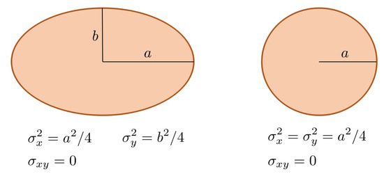 Given a 2D axis-oriented ellipse (circle) shape, it is possible to relate the variances of its pixel coordinates to the lengths of the semi-principal axes (radius). These relations are depicted in Figure 7 and can be easily obtained assuming a 2D elliptical uniform distribution for the pixel coordinates and then calculating the second order moments: , and [32].