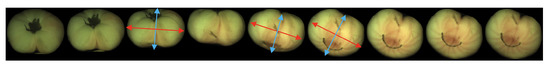 Sequence of views. Blue and red arrows indicate local minima and maxima respectively, of the sequence of the semi-minor axis. If the sequence is increasing at instant i, then . This means (for this direction of rotation) that the part below the fruit center in the view is higher than the part above the center.