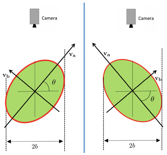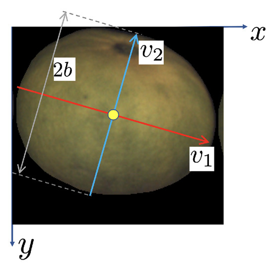 An interesting property of ellipsoids, and spheroids in particular, is that the shapes of their orthogonal projections are ellipses [30]. Given the size of the fruits and the typical height of the camera (about 1 m), perspective effects are negligible and a parallel camera can be assumed locally for each fruit [31]. Moreover, in the case of spheroids, the length of one of the principal axes of the projected ellipse is equal to one of the two equal principal axes of the spheroid. This property is used in Section 3.1.2 to determine the length of all the principal axes of the spheroid using all the available 2D views (Figure 3).