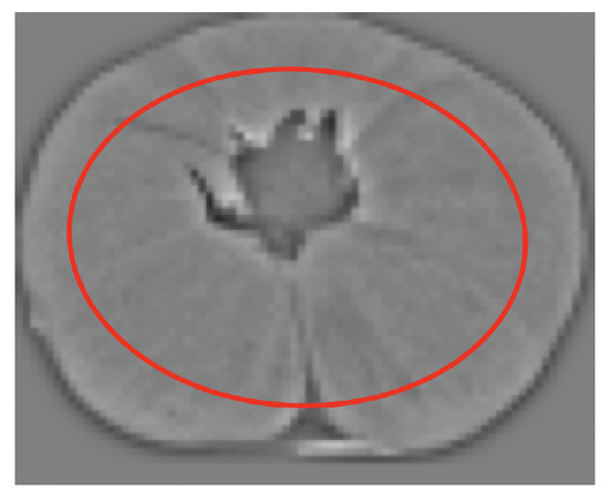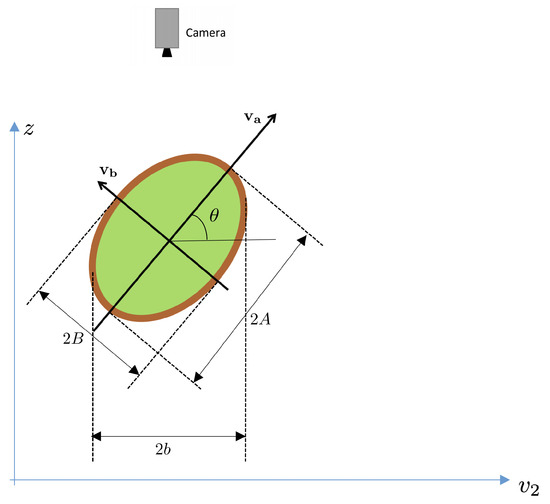 Let’s consider a cross-section of the fruit in Figure 10 through the 3D plane . This cross-section is shown in Figure 11. Notice that, in this figure, the axes are and z and allow for visualizing the principal spheroid axes ( and ).