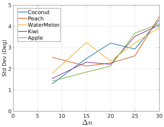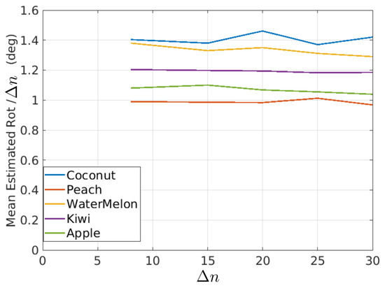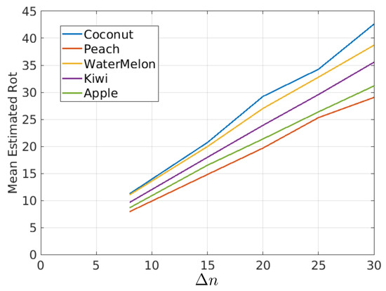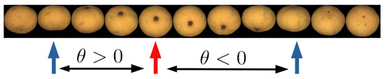 If the sequence is increasing at , i.e., , and the fruit is rotating downwards as seen from the camera (see Figure 13), the elevation angle will be , meaning that the part below the center of the fruit has a greater height than that above the center. On the contrary, if the sequence is decreasing at , the upper part will be above the fruit center. The same discussion applies if the fruit is known to be rotating upwards as seen from the camera, but with opposite results.