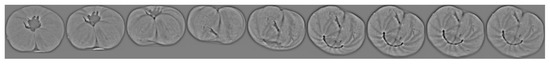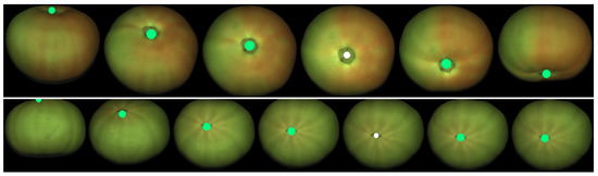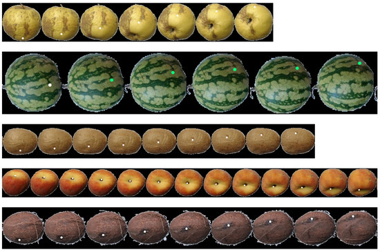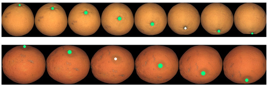 This point tracking has been applied to fruits from both datasets. Figure 25, Figure 26 and Figure 27 show some tracking results of the FruitRot3D dataset. The precision of the whole process can be observed in these figures. Two interesting examples can be seen in the two first rows of Figure 27, where the tracked point reappears after completing a full 360-degree rotation. In this figure, the tracked points are highlighted in green color if the tracked point is visible; otherwise, it is highlighted using a dark color to emphasize that it is not visible in that view (it lies on the hidden side). These qualitative examples are quite remarkable because they show that, despite many consecutive rotations being used, it is still possible to predict with relative precision where the point reappears after occlusion. Qualitative results using the Fruits-360 dataset are also provided in Figure 28. From the observation of Figure 25, Figure 26, Figure 27 and Figure 28, some conclusions can be drawn: