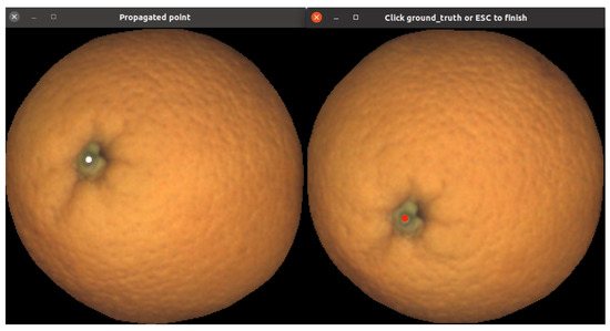 Example of point tracking in the case of two different oranges. The geometry model in this case is sphere. The sequence has been truncated to the views where the tracked point remains visible.