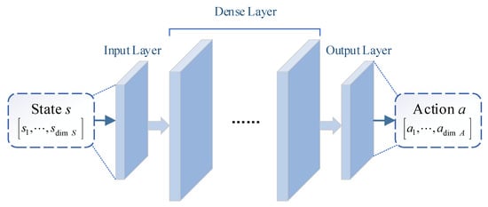 As mentioned above, DDPG is a kind of deep reinforcement learning algorithm based on the Actor-Critic framework. During the training process, the actor network outputs action according to state generated by environment. Meanwhile, TD-error is used to optimize the critic network and update its parameters. Similarly, the actor network’s parameters are optimized according to . Therefore, we must design the structure of actor and critic networks, respectively, on the basis of DL.