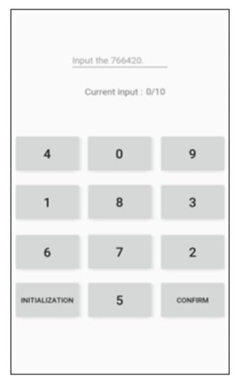 17]. The number of keystroke errors was also measured, and all these results were compared with those obtained using a normal keypad. In the case of four-digit numbers, when using the random keypad, the keystroke completion time was over 1 s longer, but the error rate was 0.01% lower, showing improved performance, compared to using the normal keypad. In the case of eight-digit numbers, the keystroke completion time was over 3 s longer, and the error rate was 0.03% higher. These results verified the usability of a random keypad for short PINs, such as four-digit ones.