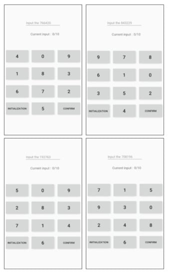 27] to assign a unique keypad to each user, in which 10-digit random numbers were created while using each number from 0–9 only once, and then these random numbers were accordingly assigned to the keypad. The normal users for each smartphone were asked to enter their PINs using a unique keypad assigned to them. Each smartphone was trained with the input data and then to try and classify users.