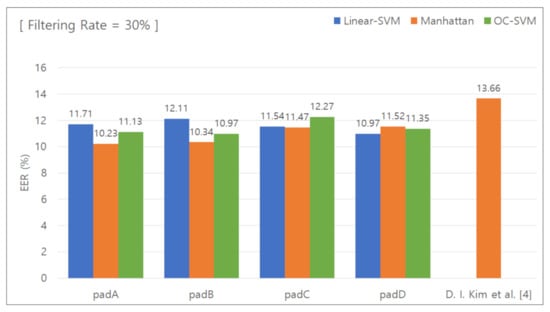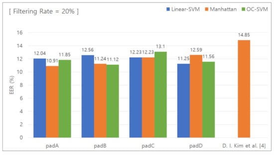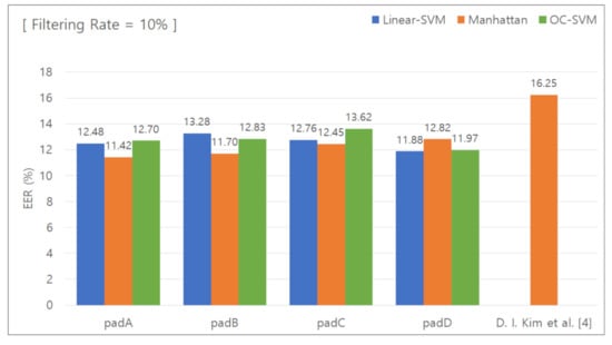 Table 4 summarizes the calculated EER values. First, the results obtained using the Manhattan distance-based classifier were examined to compare the EER values of the unique keypad-based collected data and the conventional keypad-based collected data. When the unique keypad was used, the EER was 11.42%, 11.70%, 12.45%, and 12.82% for padA, padB, padC, and padD, respectively. When the conventional keypad was used, the EER was 16.25%. The difference in the EER was 4.83%, 4.55%, 3.8%, and 3.43%, respectively, and the average difference was 4.15%.