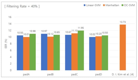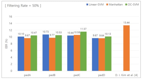 4], the EER was 3.43 to 4.82% lower. It was found that, as the filtering process proceeded further, the measured EER continued to decrease. With the data features in the lower 50% group removed, the EER was 9.67%, 9.77%, 10.58%, and 9.64%. When the data features in the lower 50% group were removed, the EER was 13.44% in [
