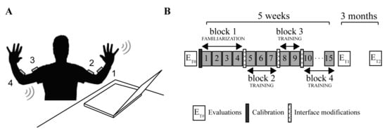 In the last decade, robotic devices and other technologies have been integrated into training programs of people with neuromotor disabilities, like SCI, with promising results [9,10,11]. In parallel with the development of robots and their introduction into clinical practice, there has also been fast progress in advancing body-machine interfaces (BoMIs). Such interfaces transform user’ body movements to control signals for external assistive devices [12,13,14], and have been considered as a safe means for achieving rehabilitative goals [15,16]. A BoMI normally requires the application of surface sensors to different parts of the body that the user is still capable to move or that need to be treated in a therapeutic intervention. The general BoMI goal is to allow the user to control, through active movements, external devices such as personal computers, wheelchairs, and assistive manipulators. Typically, the BoMI exploits two key features of the motor control system: redundancy and plasticity. Redundancy, as suggested by Bernstein [17], can be employed by the BoMIs in two manners: (a) to explore an overabundant number of body signals for extracting the best signal subspace, and (b) to find new natural subsets of solutions, either when the users’ ability decreases for the progression of a related pathology, or as it increases as a consequence of the treatment or of motor learning. Neural plasticity refers to the reorganization of connections within the central nervous system allowing the assignment of new functions to the available capacity for movement’s control. The exploitation of redundancy also requires a reorganization, or remapping, of the residual ability to control body motions. When subjects use movements of the eye [18,19], head [20,21], shoulders [22,23,24], or tongue [25,26] for driving a wheelchair or piloting a robotic arm, they associate controlling these parts of the body with functions that before the injury were performed by other parts.