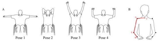 (A) The poses of the arm stabilization task from the Van Lieshout Test (VLT) manual that were evaluated in this study, from the easiest (Pose 1) to the most difficult one (Pose 4). (B) Markers placement on the anatomical landmarks of acromion (A), elbow (E), wrist (W) and C7 (C) used in the kinematic analysis. The marker on C7 is displayed in the figure, despite the frontal view, to simplify the visualization.