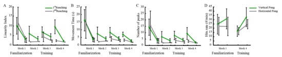 Performance metrics. Reaching tasks: linearity index (A), movement time (B) and number of peaks in the velocity profile (C). First and last sessions of the familiarization phase, first and last sessions after the 1st, 2nd and 3rd map modification of the training phase. Pong hits rate during vertical and horizontal pong (D). For the Pong tasks we are reporting only values at the beginning (respectively session 3 for vertical pong and session 4 for the horizontal pong) and end of the familiarization and at the beginning and end of the last change of the interface. We reported the mean values and standard error of the subjects.