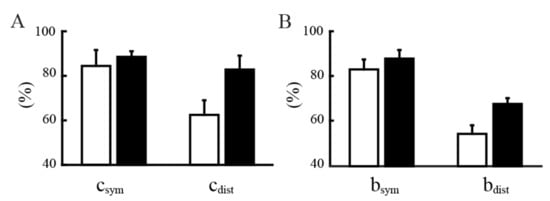 Symmetry and distality indices for body contribution to cursor movement (A) and for body mobility (B) at the end of the familiarization phase (white bars) and end of training (black bars). The indices are calculated for representing the symmetry between right and left upper body ( and ) and for representing the usage of more distal body parts ( and ).
