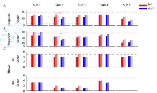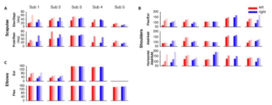 Range of motion. Results of the Range of Motion (ROM) for each subject before (dark shade), at the end (medium shade) and 3 months after the end of the training (light shade) for the left (shades of red) and right (shades of blue) body parts. The results are presented divided by upper-body districts: scapulae (A), shoulders (B) and elbows (C).