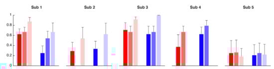 Normalized scores assigned to each body side (right in blue and left in red) averaged across the four poses performed by each subject (columns). The evaluation was performed before the BoMI treatment (T0, dark shades), at the end of the BoMI treatment (T1, medium shades) and three months after (T2, light shades).