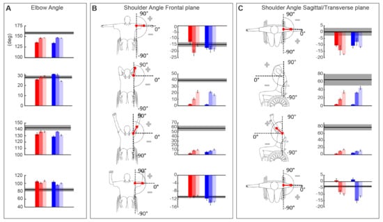 Kinematic parameters of the stabilization task for an example subject, SCI1. In each panel each row indicates the parameters relative to pose 1, pose 2, pose 3 and pose 4. In the shades of red the parameters extracted from the left body parts while in the shades of blue the one from the right body parts at T0 (dark shades), T1 (medium shades) and T2 (light shades). The grey area in each graph represents mean and standard error of each parameter for the control subjects (mean ± SE). (A) Elbow Angle—EA. (B) On the left a schematic description, for each pose, of the computed angle and on the right the results of the Shoulder Angle on the Frontal plane—SAF. (C) Schematic description, for each pose, of the computed angle on the left side and Shoulder Angle on the Sagittal/Transverse plane -SAST- graphs on the right.