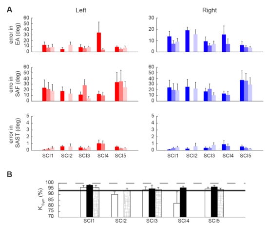 Figure 8 depicts the trend of all the three kinematic parameters EA, SAF, and SAST computed for a representative subject (SCI1), respectively, to evaluate distal movements (EA) and proximal movements (SAF and SAST) for both left and right body side. This subject showed a global improvement in EA, while the other two kinematic parameters improved only for pose 2 and 3. The individual results for the other subject are similar and reported in the Supplementary Materials.