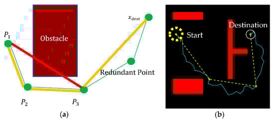 The path obtained by the RRT algorithm was plagued by the randomly generated nodes that can result in a poor connectivity path. Furthermore, the path was often not continuously differentiable and was thus infeasible for vehicle implementation. Pruning is a prerequisite for smoothing. The pruning process shown in Figure 2 was conducted to remove the redundant points in the RRT algorithm for a new path without colliding with obstacles. The process started from three consecutive path points, , and as illustrated in Figure 2a. If there was no collision, and were directly connected as a new path and was redundant. Conversely, if a collision was found between and , then was retained as the path point. The pruning process can remove redundant path points and obtain a more efficient path to the destination, as illustrated in Figure 2b.