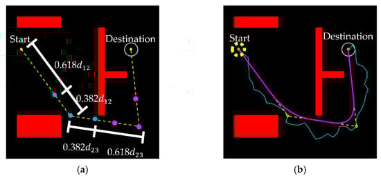 The random nature of the RRT algorithm makes it capable of finding a path to the destination in complex space, but there definitely will be more than one path to the destination. For example, there are many feasible paths, upward or downward, as illustrated in Figure 5a. In terms of path length, the downward path is not as efficient. It is thus important to find a “near”-optimal path for efficient planning. The path planning will be repeated to yield multiple results, which are then compared to find the desired path. To ensure safety, the path points are checked to see whether they are in free space during every planning stage of the improved RRT algorithm. If all path points are in free space, the result of the smoothing process is retained as a candidate path; conversely, the path is abandoned and the planning repeats until a path is found.