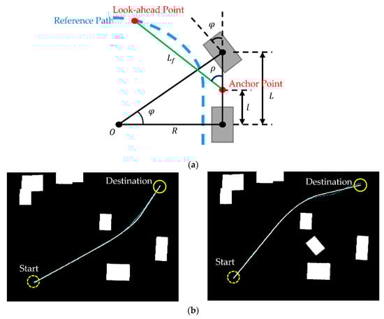 In order to validate the effectiveness of the improved RRT algorithm in obstacle avoidance, an autonomous vehicle with a pure pursuit controller and a proportional–integral (PI) speed controller was applied to track the planned path. The pure pursuit controller was used to set a look-ahead point at a fixed distance in front of the vehicle from its current position. The geometric relationship between the vehicle and the look-ahead point, as illustrated in Figure 7a, can be defined to obtain the control command of the steering angle , where is the vehicle wheelbase, is the radius of curvature with respect to the rotation center of the vehicle, is the forward drive look-ahead distance, is the distance from the rear axle (for rear wheel drive) to the forward anchor point, and is the heading of the look-ahead point (constrained on the planned path) from the forward anchor point with respect to the vehicle heading. Details of the vehicle kinematics model can be found in []. A PI controller, , is used for speed control, where is the speed control command, and are the proportional and integral gains, respectively, is the command velocity, and is the vehicle speed. The advantage of using the steering controller and speed controller is that they can provide good results with minimal computation load. Advanced controller design can also be implemented on the onboard computer with sufficient computation power.