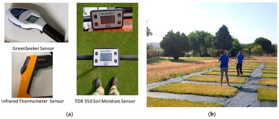 In this study, we included six parameters, which include the monitorisation of soil and plants. With regard to the soil, SM and ST were measured; for the measurement, we selected a TDR 350 FieldScout []. SM was measured as the volumetric water content in percentage with a precision of ±0.3%. ST was measured in °C with a precision of ±1 °C. The data of SM and ST were measured at 5 cm depth. In each plot, three measurements were performed to obtain the mean value. The measures were gathered, guaranteeing that they represent the entire plot, including the central and edge areas. The desired values of SM to have turfgrass with high quality is between 30 to 40 %. Since the soil in which we performed the measures in sandy loam soil, SM’s values can range from 5–10% to 40–45%.