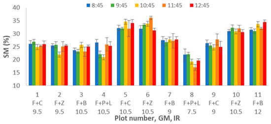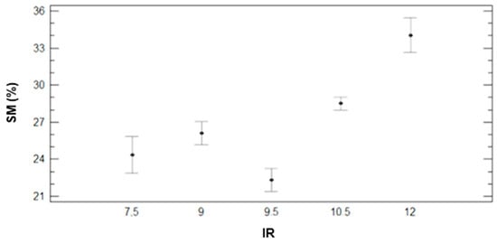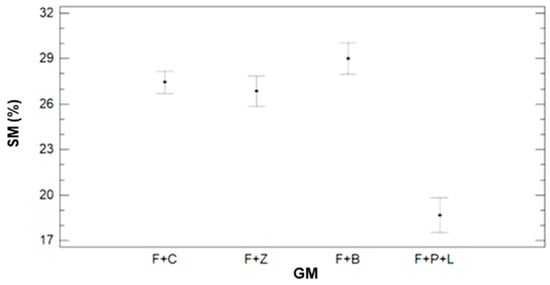 To properly evaluate the effects of DAT, GM, and IR on this variable, multifactorial ANOVA is performed. The results indicate that the data variability is caused by GM and IR, with p-values of 0.0000 for both factors. Meanwhile, the DAT does not affect gathered data of SM, with a p-value of 0.8722. Following, we show in Figure 3 and Figure 4, the variability of SM for GM (Figure 3) and IR (Figure 4). The error bars represent 95% of Fisher LSD intervals. In Figure 3, we can see that GM has a severe effect on the data of SM. There are big differences between F+P+L and the rest of GM. In previous work [], we determined that this GM requires more water than the other ones. Therefore, the values of SM are lower in the plots with F+P+L, compared with other mixtures. The mean value of SM for F+P+L is 18.66%. With regard to the other GM (F+C, F+Z, and F+B), the three of them have similar SM values. According to the multiple range test of the ANOVA, we can identify two groups; the F+P+L composes the first group with the lower SM. The second group, characterised by higher SM, comprises the rest of the combinations, with mean values of 27.46%, 26.85%, and 29.02% for F+C, F+Z, and F+L.