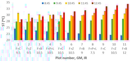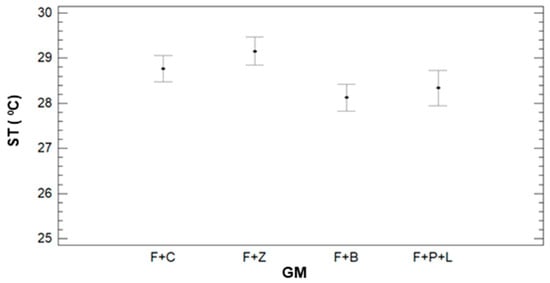 The multifactorial ANOVA is performed, and the results point out that all the variables have p-values lower than 0.05. Thus, the observed variability of the data is caused by GM, IR, and DAT. According to the ST variance for the different GM and the multiple range tests results, we can identify three groups (see Figure 6). The first group is composed of F+B and F+P+L with mean values of 28.12 °C and 28.34 °C. F+B and F+C compose the second group. Finally, F+C and F+Z form the last group with mean values of 28.76 °C and 29.15 °C. With regards to the IR, no clear tendency is observed between TS and IR. Therefore, these results are not included as a figure.
