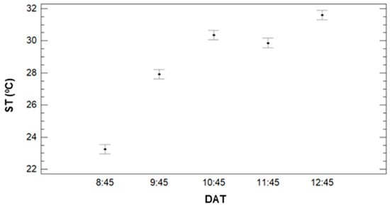 Regarding the effect of DAT, several differences are observed in the ST data, see Figure 7. The data of ST clearly increases with the DT, as previously observed in Figure 5. With the multiple range tests, we identify four groups: the group with the lowest ST, the one composed of DAT data = 8:45. The mean value of ST of this group is 23.25 °C. The second group is formed by DAT = 9:45, with a mean value of 27.91 °C. Data measured in the third and fourth DAT, with mean values of 29.86 °C and 30.36 °C, are included in the thirds group. Finally, the data from DAT = 12:45 is classified as the fourth group, with a mean value of 31.59 °C.