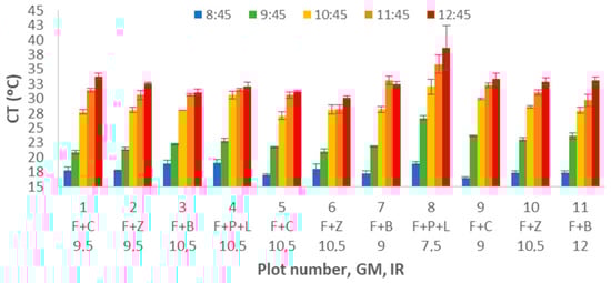 The analysis of CT data is presented in Figure 8. Several similarities can be found between ST and CT data. We clearly identify the increasing pattern with the DAT. Nonetheless, as in this case, temperature measurement is based on the infrared measure, the measure is not affected by the temperature of the sensor, and no time is needed to have a stable measurement. Therefore, the effects are more evident with this data. The lowest measured data was gathered at plot 9 in the first DAT; CT was 16.5 °C. The highest value was measured at plot 8 during the last measuring time, 35.9 °C.