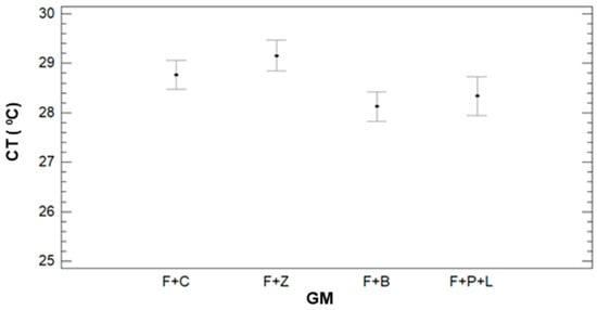 To evaluate the impact of each factor in the variance of CT, we analyse the results of multifactorial ANOVA, and see the mean values and LSD intervals in Figure 9. As for the ST, all the factors have a p-value lower than 0.005. The first described factor is GM. We can identify that the CT for F+C, F+Z, and F+B are almost equal and considered a single group. The mean values for these GM are 26.82 °C (F+Z), 26.89 °C (F+B), and 26.90 °C (F+C). The other group is composed of F+P+L with a mean value of 28.22 °C.