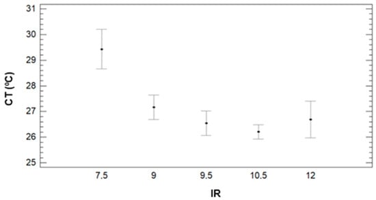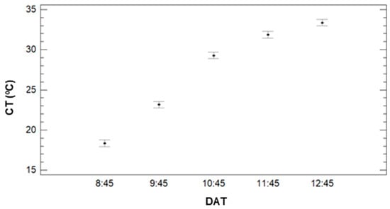 Concerning the effect of IR, see Figure 10, we can clearly identify CT’s decrease when the IR increases. The multiple range tests created three different groups. With lower CT values, the first group is composed of 9.5 to 12 mm of irrigation with Ct values of 26.5 °C (IR = 9.5), 26.2 °C (IR = 10.5), and 26.7 °C. Last, the effect of DAT is described in Figure 11. It is possible to identify the increasing pattern, which was identified in Figure 8. According to the different created groups with multiple range test, five groups are created. Each group contains a single DAT, and the groups confirm that the CT increases with the DAT. Mean values are 18.34 °C (8:45), 23.15 °C (9:45), 29.29 °C (10:45), 31.89 °C (11:45), and 33.37 °C (12:45).