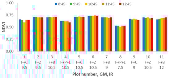 The results of NDVI indicate very stable data along all the studied period. We can identify differences among the measured plots due to GM and IR, but the differences are not related to the DAT. The highest NDVI values are registered in plot 6, F+Z and 10.5 mm of IR. In this plot, the value of NDVI reached 0.763 at DAT = 11:45. The lowest values are always gathered in plot 8 (F+P+L with IR = 7.5), the lowest at 0.51 being measured at DAT = 10:45. As shown in Figure 12, no effect of DAT is found according to the gathered data.