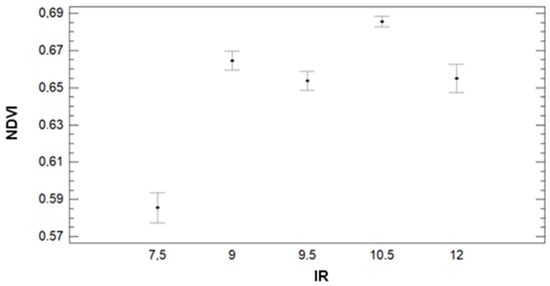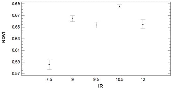 Regarding the results of ANOVA analyses, we can identify an apparent trend between NDVI and IR. The NDVI is lowest for the lowest IR value and increases considerably for the rest of the IR values (see Figure 13). Concerning the multiple range tests, for IR = 7.5, the average value of NDVI is 0.59, and those data compose the group with the lowest NDVI values. The second group comprises data from IR = 9, 9.5, and 12 with average values of NDVI of 0.66, 0.66, and 0.65, respectively. Finally, the group with the highest NDVI (average value of 0.69) is formed by data of plots with an IR of 10.5. Finally, with regard to Figure 14, the GM has a great effect on the NDVI. This effect is clearly indicated in the multiple range tests. The GM with the lowest NDVI values, the first group, is the F+P+L with an average of 0.58. The second group is composed of F+C, with an average NDVI of 0.66. Finally, F+B and F+Z have average NDVI values of 0.68 and compose the third group.