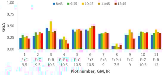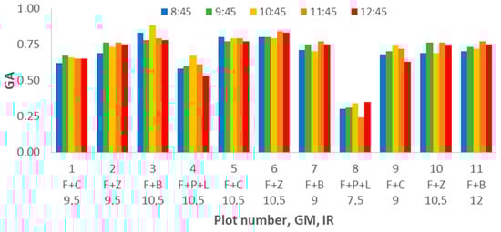We analyze the variation on the second vegetation index, the GA, measured during the study. According to the results shown in Figure 15, we can clearly identify the decrease of GA for the plots composed of F+P+L compared with the other GM. Contrary to the results found for NDVI, in GA, we can identify the effect of DAT. Most of the plots have their lower GA value at DAT = 8:45 and their maximum GA at DAT = 9:45 or DAT = 10:45. The results of analysing the gathered data with multifactorial ANOVA indicate that DAT, GM, and IR are the factors that explain the variation in data. The p-values for GM and IR are 0.0000; meanwhile, for DAT, the p-value is 0.0198.