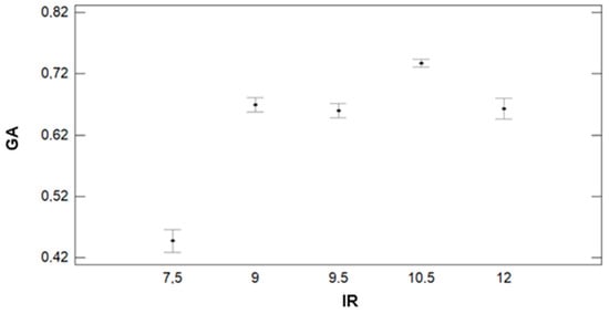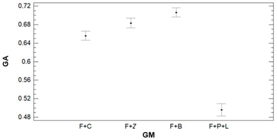 In Figure 16, we can see that IR has a clear effect on GA. According to the results of the ANOVA, we can identify three groups. The first groups with the lowest GA values are composed of the lowest irrigation plots (IR = 7.5). This group is characterised by an average value of 0.45. The second group, formed by plots with IR = 9, 9.5, and 12 mm, has an average GA value of 0.65 (9 mm) and 0.66 (9.5 and 12 mm). The last group is composed of plots with IR = 10.5 mm. In this group, the average GA value is 0.74. The effect of GM on the GA can be seen in Figure 17. We can find big differences in GA values between F+P+L and the rest of GMs, as shown for the other parameters. The values of GA are lower for the plots with F+P+L compared with GMs. The mean value of GA for F+P+L is 0.50, and this GM composes one of the four groups defined by the multiple range tests. The F+C composes the second group, with an average GA of 0.66. The third group is formed by F+Z, which has 0.68 as the average GA value. F+B composes the last group, with the highest GA value. The value of GA for F+B is 0.71, representing an increment of 42% compared with the GM of F+P+L.