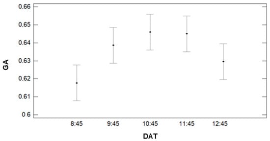 Finally, the effect of DAT on the variability of GGA is analysed in Figure 22. For this parameter, the multiple range test concludes that there are three different groups of data. The data gathered at DAT = 8:45, 9:45, and 12:45 composes the first group. The lowest values of GGA characterise this group. The average GGA value for data gathered at those DATs is 0.26, 0.27, and 0.28 for DATs 8:45, 12:45, and 9:45, respectively. The second group is formed by DAT = 9:45 and DAT = 11:45. The average GGA is 0.28 for DAT = 9:45 and 0.29 for DAT = 11:45. Finally, the last group comprises data gathered at DAT = 10:45, characterised by the highest GGA value. The average GGA for DAT = 10:45 is 0.32.