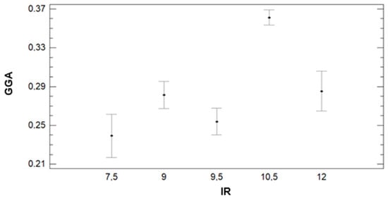 Figure 20 presents the variability of GGA for the different IR regimens. Contrary to the tendency found with GA data, for GGA, the generated groups by the multiple range test have no apparent relation to the IR changes among the plots. In this case, three groups are identified. The group with the lowest GGA comprises plots with IR = 7.5, 9.5, and 12 mm with 0.24, 0.25, and 0.29 value for GGA. The second group is formed by plots with IR = 9 and 12 mm. The average GGA for plots of this group is 0.28 and 0.29, respectively. The plots with 10.5 mm of irrigation compose the last group, characterised by the highest value of GGA. The plots with IR = 10.5 have, on average, GGA value of 0.36. As mentioned before, those results are slightly different from the results of multiple range tests of GA for the IR factor.