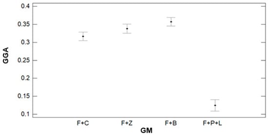Regarding the effect of GM on the variability of GGA, data is presented in Figure 21. This data is similar to the results found for the GA index. Despite GA, the multiple range tests identified four groups; in this case, only three groups are identified. The first group, characterised by the lowest GGA values, is composed of F+P+L. The average GGA value for this group is 0.12. The second group is formed by F+C, with an average GGA value of 0.32. Lastly, F+Z and F+B compose the last group, with average values of 0.34 and 0.36.