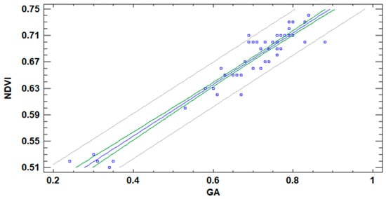 Several papers pointed out the correlation of NDVI with GA index in turfgrass [,]. Nonetheless, in those publications, the authors do not indicate if the data of both variables were collected at the same time or not. Considering that DAT has an effect on the GA index but not on the NDVI index, it is essential to confirm that the correlation between both variables can be done regardless of the DAT. Therefore, all the pairs of data from NDVI and GA, as well as a regression model, are included in Figure 23. In Figure 23, we can see the linear regression model and its confidence and prediction intervals. Although the linear regression model is not the one with the better correlation, the differences between the linear model and the one with the highest correlation are minimum (−0.96 and −0.95). Thus, to keep the model as simple as possible, we maintain the linear regression. The model presented in (1) has a Mean Absolute Error (MAE) of 0.013 and an R2 of 91%.