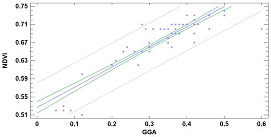 The correlation between NDVI and GGA is also pointed out in several studies [,]. Figure 24 represents the pairs of data GGA and NDVI calculated based on the gathered data. Again, linear regression is selected to simplify the model. The model, presented in (2), has an MAE of 0.020 and R2 of 78%: