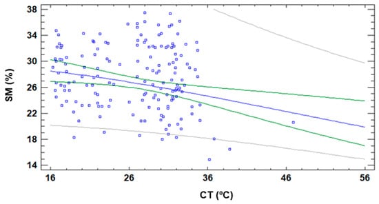 Another well-known correlation is the one that models SM and CT; it is widely used when plant stress is monitored []. Considering that SM is not affected by the DAT and CT is strongly affected, it is necessary to evaluate if this correlation is maintained. Figure 25 displays the data of both variables as well as the most accurate regression model. Even though we selected the regression model with the highest correlation, the obtained correlation for SM and CT is very low. The correlation coefficient of the obtained model is 0.22. It is characterised by an MAE of 0.006 and an R2 of 5%. Thus, we can affirm that the effect of DAT in CT is so high that it invalidates SM’s correlation.