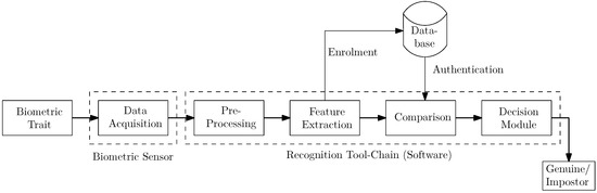https://www.iso.org/standard/66693.html, accessed on 1 March 2021), biometric recognition is the “automated recognition of individuals based on their biological and behavioural characteristics”. The most commonly used biological characteristics or biometric traits include faces, fingerprints, and irises. A typical biometric recognition system consists of several modules, as shown in