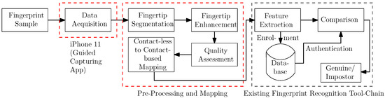 The focus of this paper is not on proposing a final solution that outperforms the existing competitors in terms of recognition performance. The main contribution of this paper is an engineering study covering an in-depth analysis and comprehensive evaluation of the main stages of the FP processing toolchain in the context of the BioCapture Project: data acquisition, FP preprocessing, and comparison of contactless FPs against contact-based ones. The FP preprocessing includes FP detection, segmentation, and image enhancement. For fingertip detection and segmentation, several traditional handcrafted feature-based algorithms as well as convolutional neural network (CNN)-based ones were tested. During the subsequent image enhancement, not only is a filtering-based enhancement performed but also a DPI (dots per inch) correction is applied first. Several different options are presented and evaluated for each stage. Based on the evaluation results, a recommendation for which option to employ is derived for each stage. These recommendations provide guidance towards the solution that is ultimately implemented and for further work on this topic. To the best of our knowledge, such a detailed in-depth study of all the different parts of the recognition toolchain has not been performed before.