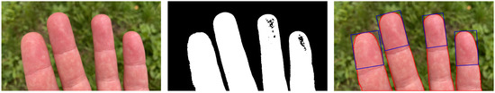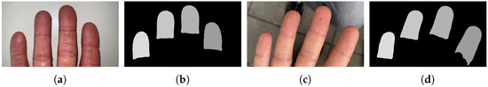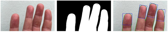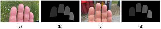 ). Each video had a length of between 10 and 15 s and a frame rate of 30 fps, and they were stored in .mov format and had a resolution of 3840 × 2160 pixels. A total of 2128 frames were extracted from all of the videos, equally distributed over all the scenarios, and the fingertips in each frame were manually annotated. The annotated frames were used to train and evaluate the fingertip detection and segmentation approaches presented in