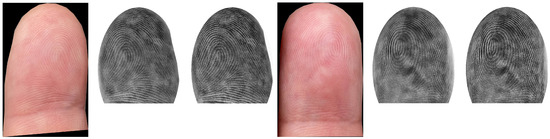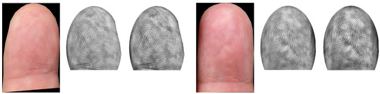 https://www.hidglobal.com/products/readers/single-finger-readers/lumidigm-v-series-FP-readers, accessed on 1 March 2021), the Lumidigm V311 (denoted as V311 in the following), which was produced by the US company HID Global. It includes multispectral imaging technology that allows FP images to be captured when there are difficulties in distinguishing FP features (dirty, aged, dry, wet, moist, or incorrectly placed fingers). The resolution of the FPs that are acquired is once more 500 dpi. In total 680, FP images were captured with each of the devices deployed. The acquisition process was carried out indoors under artificial lighting conditions. Examples of corresponding contactless and contact-based FPs are shown in