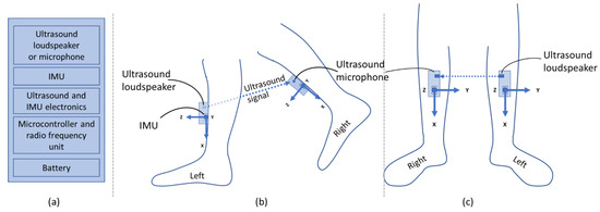 System concept (a) with one pair of modules attached to the lower leg seen from the side (b) and from the front (c). The modules consist of an Inertial Measurement Unit (IMU) and either an ultrasonic loudspeaker (in this case, left leg) or a microphone (in this case, right leg). The ultrasonic signal is marked with a dashed arrow, and the coordinate system of the IMUs with solid arrows.